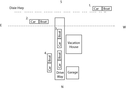 As you approach the house (#1), you will want to pass the driveway and pull off the road onto the "grassy" margin of the road (#2). The margin of the road is very wide. Now you can easily back into the driveway (#3) without the stress of the road traffic. If you have two boats with transports then you can either stack them on the driveway (#3)or park them side by side (#4) by parking one boat on the grass next to the driveway. |